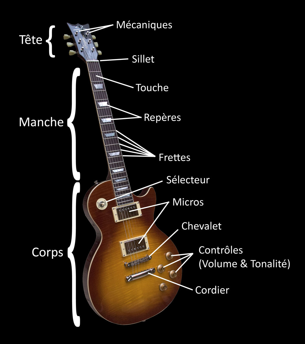 C’est une guitare de forme dite « Les Paul » (d’après une très célèbre Gibson, donc), et je l’ai agrémentée du nom de ses composants.