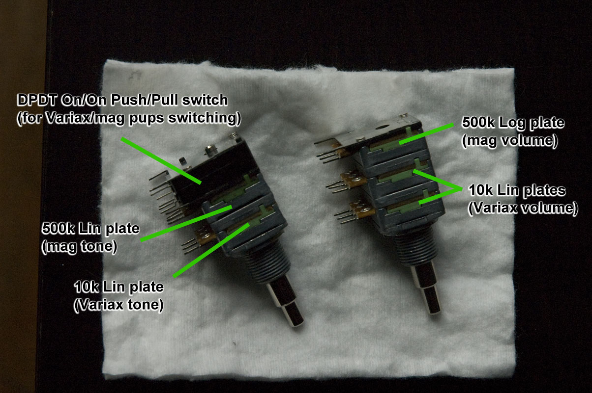 • J’ai trouvé des potards triple de chez Alpha je crois, et je les ai désassemblés (les impédances ne correpondaients pas).
