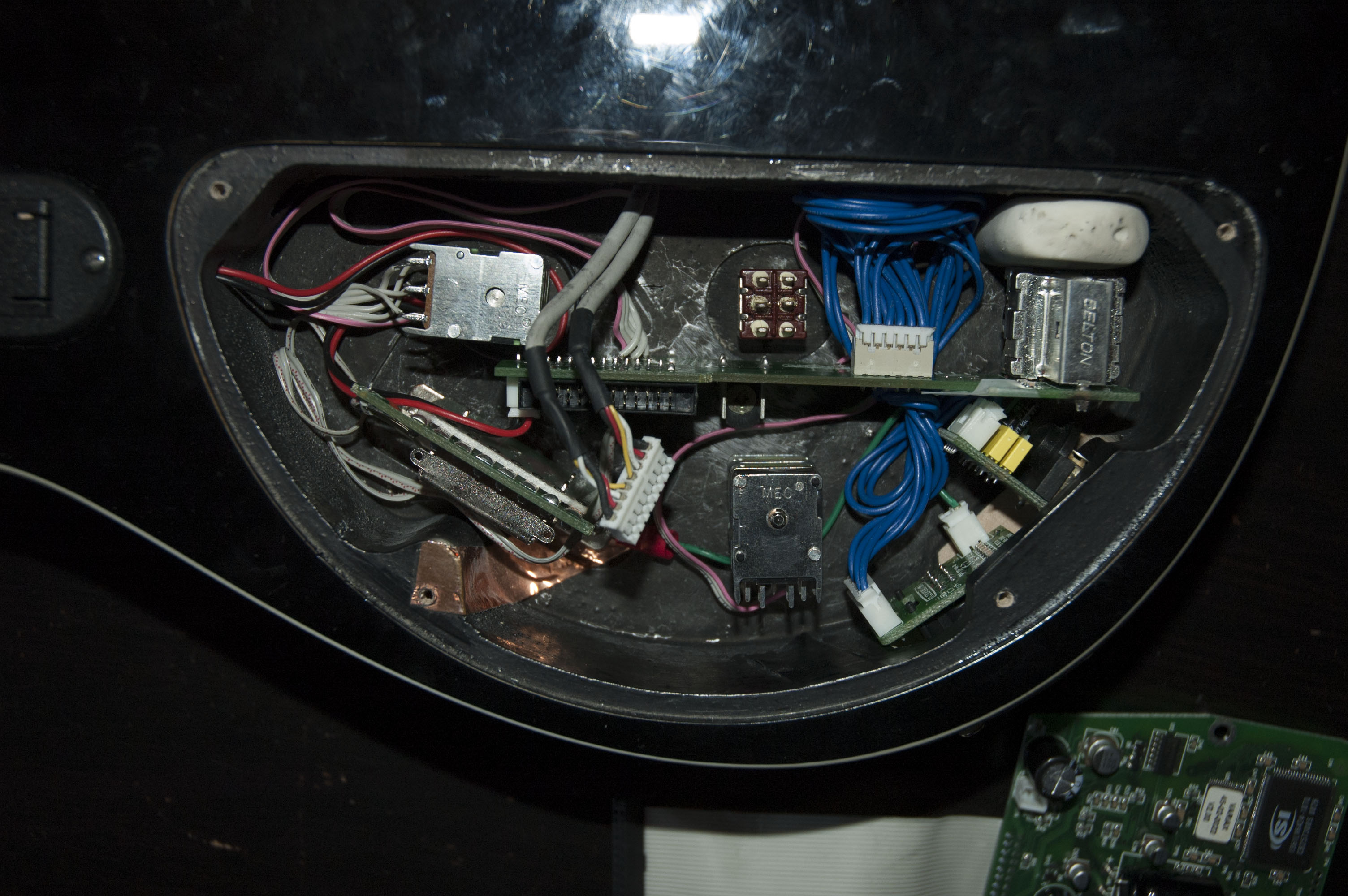 Je viens de retomber sur la série de photos que j’avais prises lors de l’intégration des entrailles d’une Variax 300 (Line6) dans une mignonne petite Peavey (une Generation EXP Custom, un genre de Telecaster survitaminée aux Piezo).